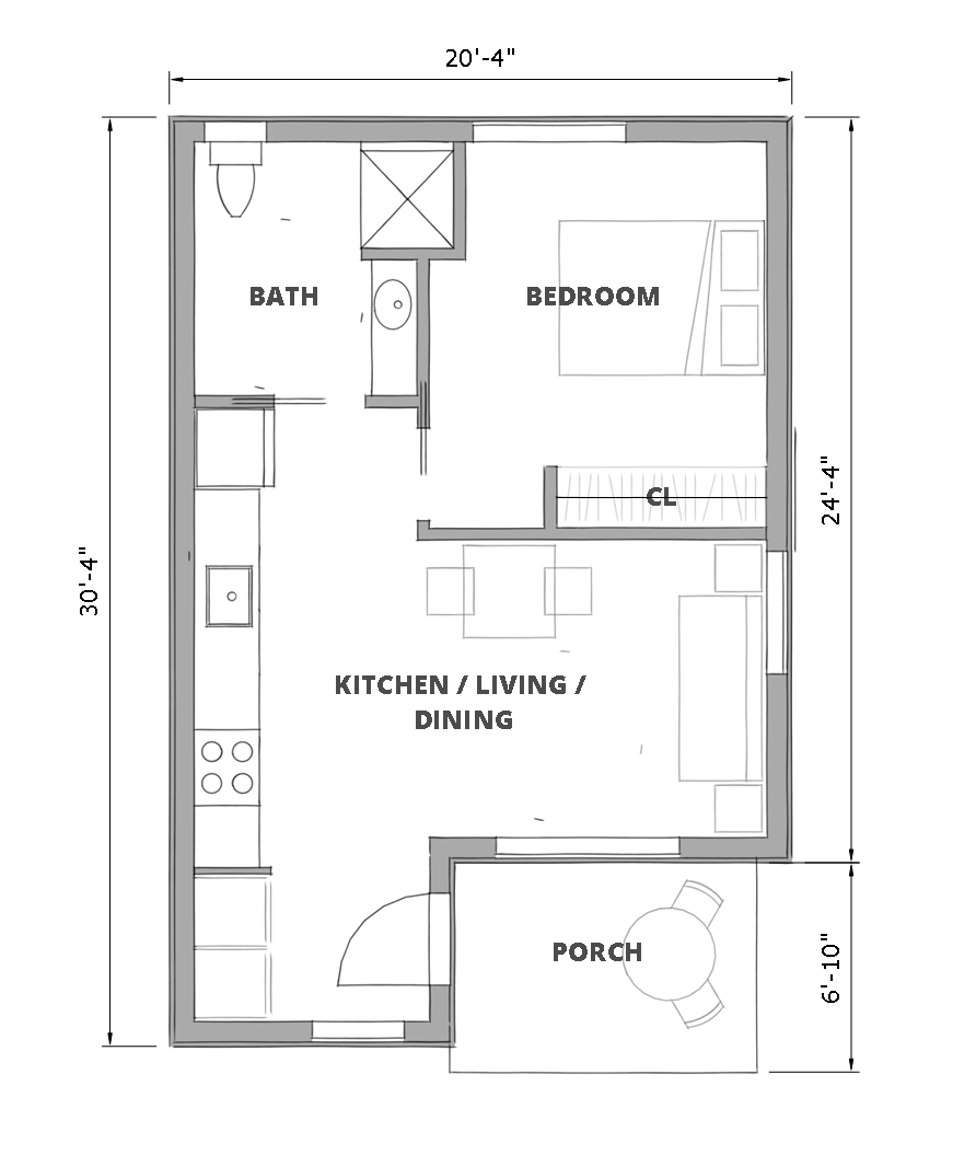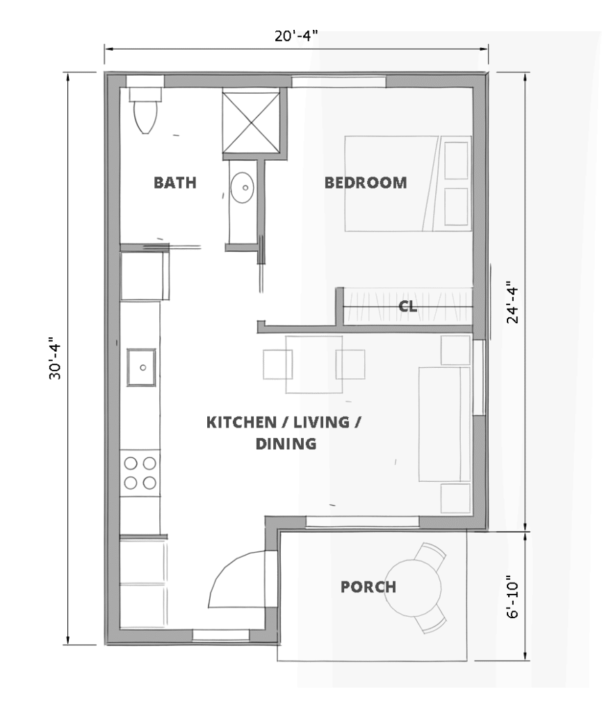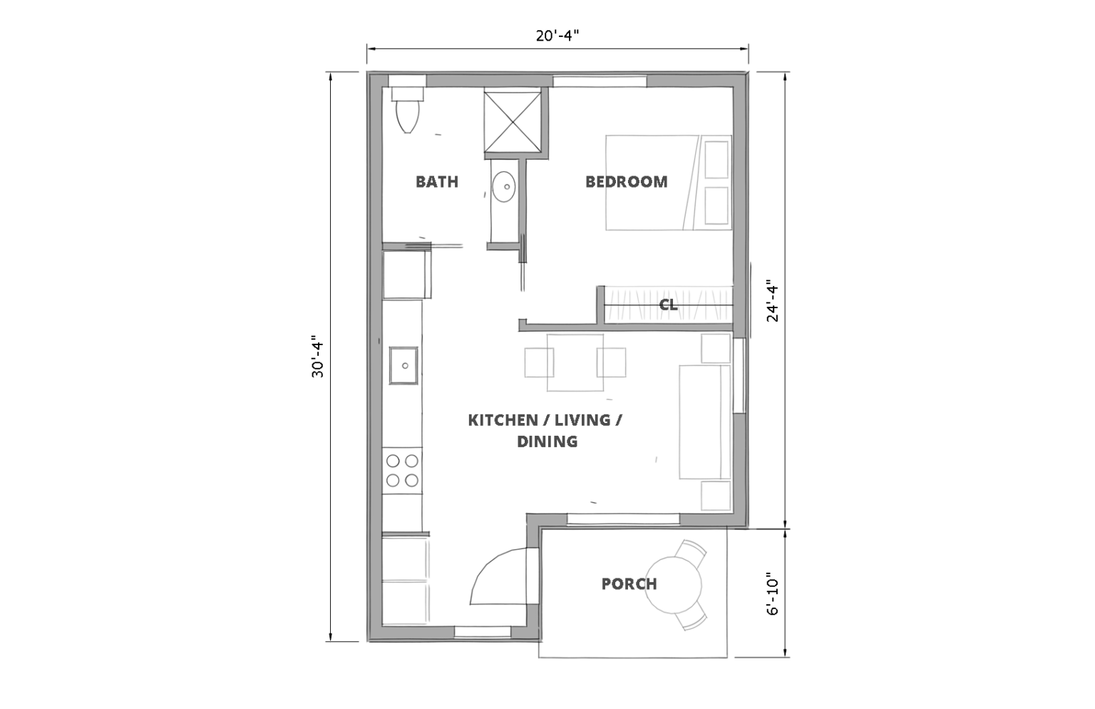 This modest home allows for the opportunity to age in place as a single-story dwelling. This design is perfect for accessory units for a family member who is aging or with limited mobility. It can also be stacked to form a duplex.