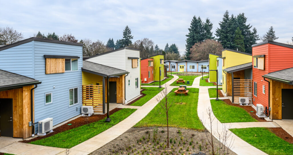 An infill affordable housing development on a former church property, this 70-unit campus will deliver homeownership access for very low-income folks (< 60% AMI) through a limited-equity housing cooperative and community land trust. The design incorporates a number of “tiny townhouses” alongside two 12-unit micro apartment buildings. The site design carefully balances the need for housing density with the desire for naturescape connection and socially-oriented courtyards. All of the homes feature a functional front porch or balcony with visual connection to social activity zones and landscaping. Many make cost-effective use of space with optional sleeping lofts in addition to ground-level bedrooms that support accessible living.
